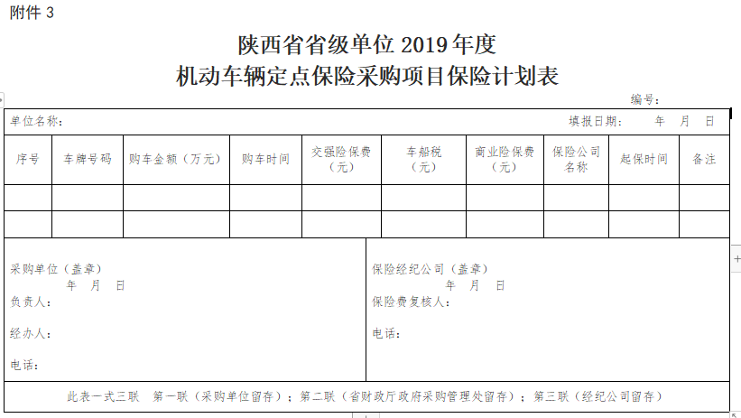 省级各单位填报《陕西省省级单位2019年度机动车辆定点保险采购项目保险计划表》一式三联(见附件3)(以下简称“《计划表》”),由定点保险公司计算保险费并送安诺保险经纪有限公司进行复核,核对无误后由安诺保险经纪有限公司在《计划表》上加盖安诺保险经纪有限公司政府采购业务专用章确认。每月由安诺保险经纪有限公司将《计划表》汇总报陕西省财政厅备案。
